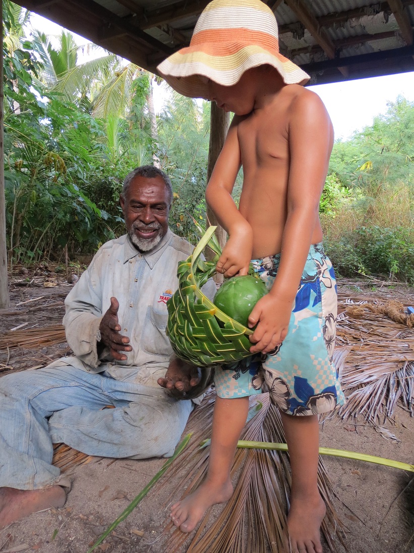Schwupp schon ist die Tasche fertig. Geld will er keins, aber nach einer Weile fragt er leise, ob wir vielleicht Angelsehne haben. Hui zum Glück haben wir welche! Und eine paar Haken finden wir auch noch..