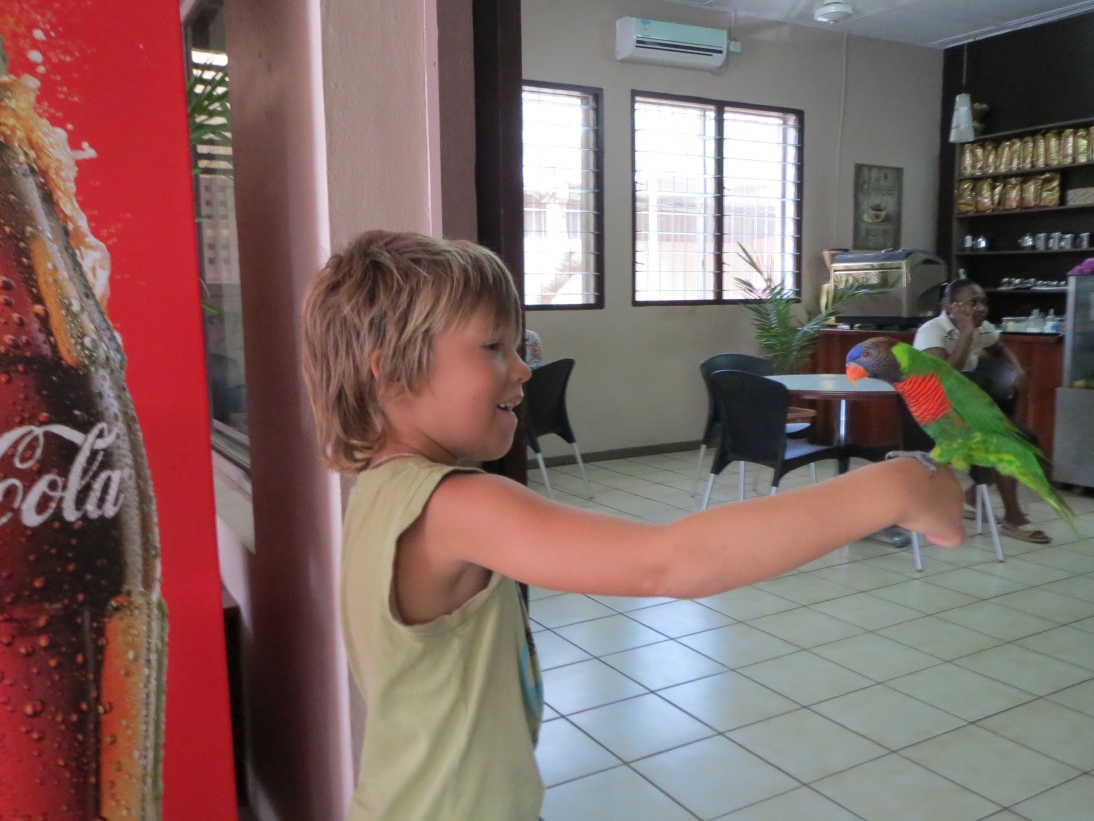 In Luganville erwartet Jaron eine kleine Ueberraschung! Jetzt will er natuerlich hier im Cafe wohnen…