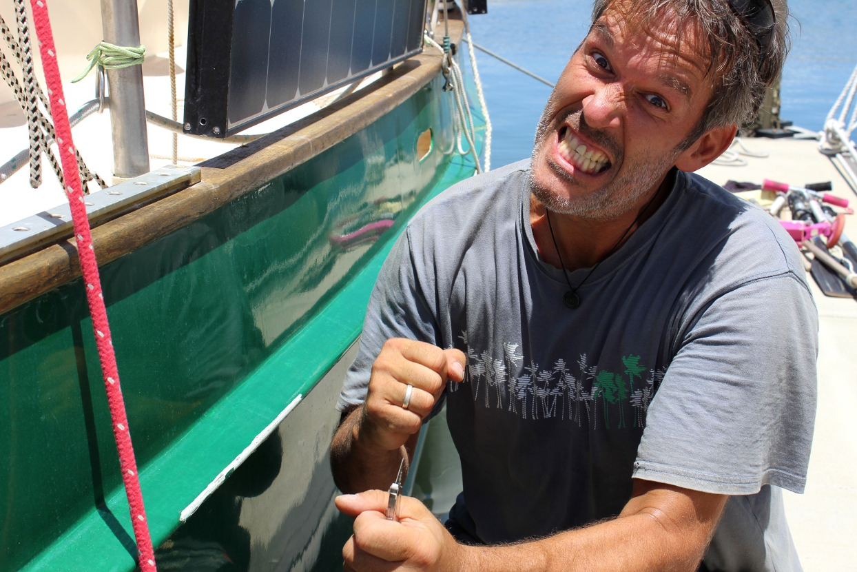 JA und dann passiert dem Kapitän das Unglaubliche: beim Wenden der Supermolli (um auch die andere Seite schön zu polieren) ratscht er doch tatsächlich noch am Pöller vorbei und hinterlässt eine grüne Spur! Ich kicher und der Kapitän ärgert sich wegen der extra Arbeit.. Hihi