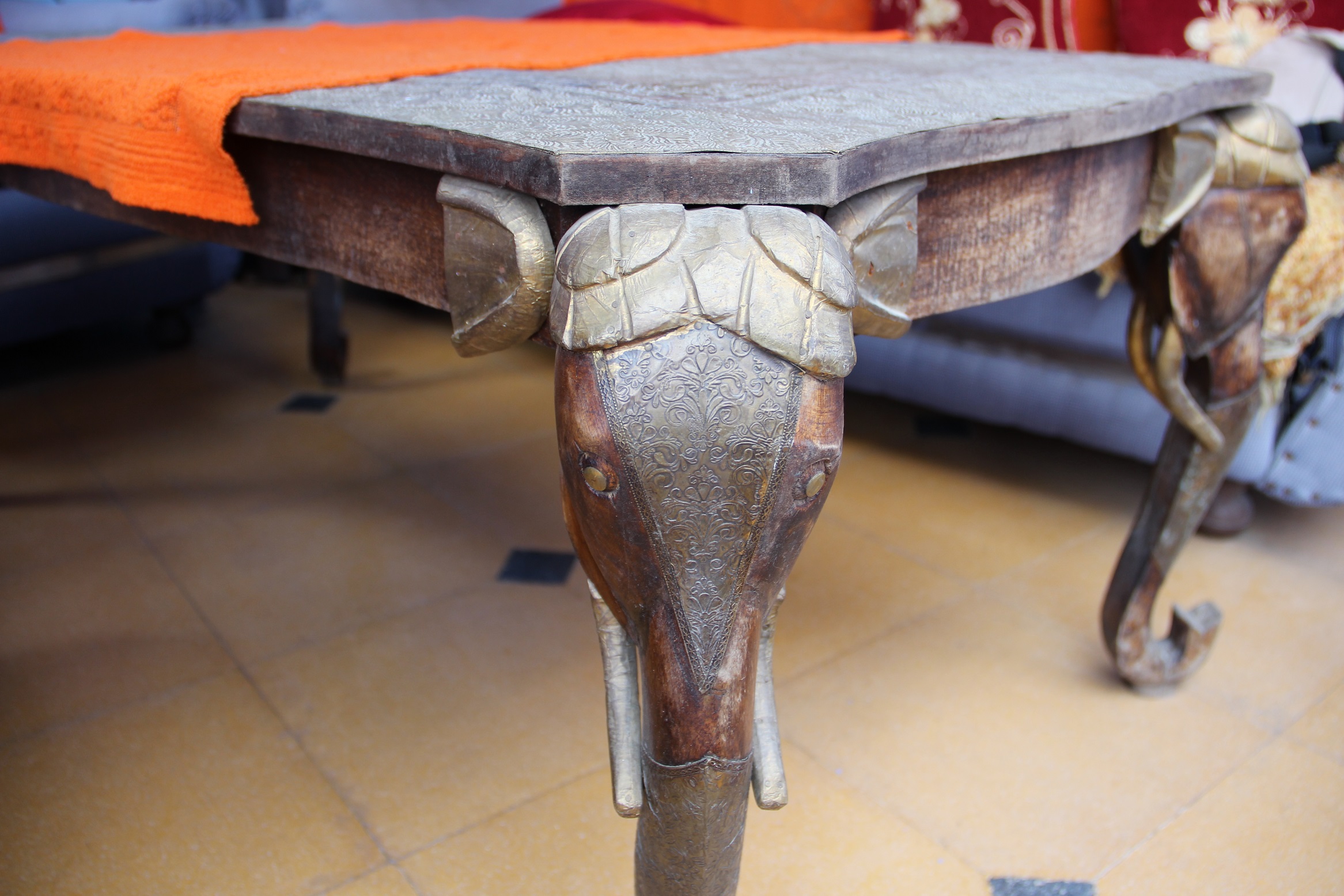 Ein wunderschoener Elefantentisch, haeufig wird in Indien das Holz mit einem Metall ueberzogen und verziehrt.