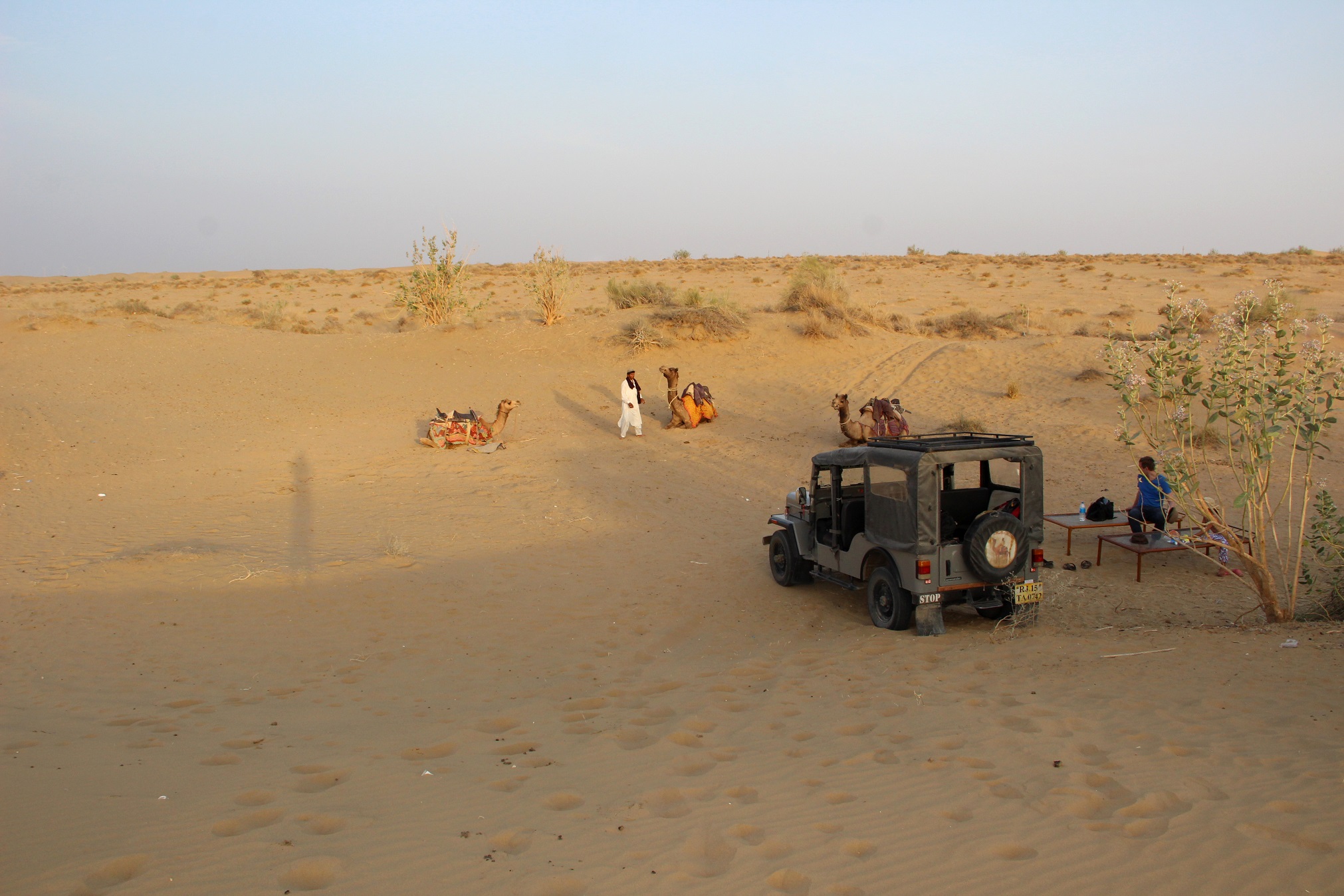 Unser Lager. Wir vier essen noch hier mit den Beduinen, geniessen ein wenig die Wueste und fahren dann mit dem Jeep zurueck nach Jaisalmer. Patrick uebernachtet hier..