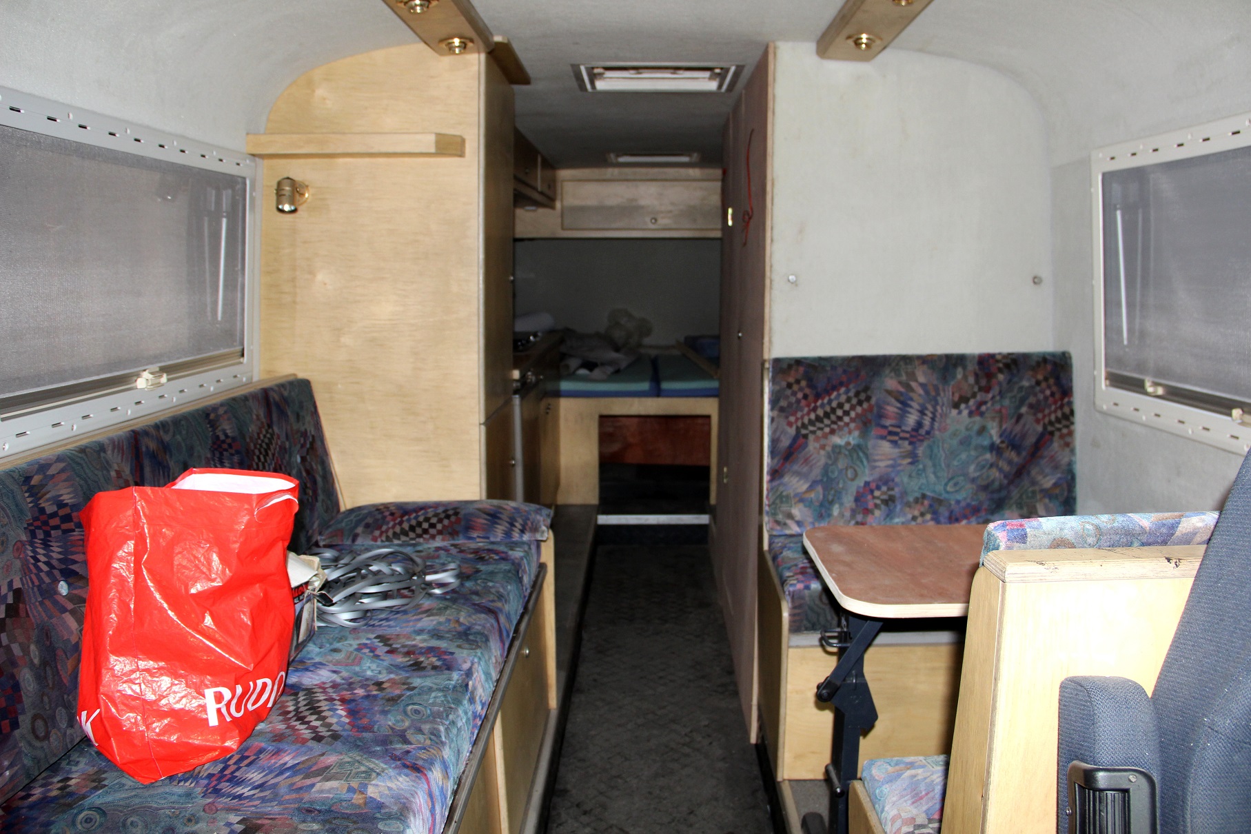 Von Innen etwas gewoehnungsbeduerftig.. Links das “Sofa” und Jarons Bett, rechts die Sitze und Linas Bett. Weiter hinten links ein grosser Schrank mit der Kueche dahinter, rechts eine riiiesige Dusch- und Klokabine gefolgt von einem Schrank und ganz hinten quer das Ehebett 😉