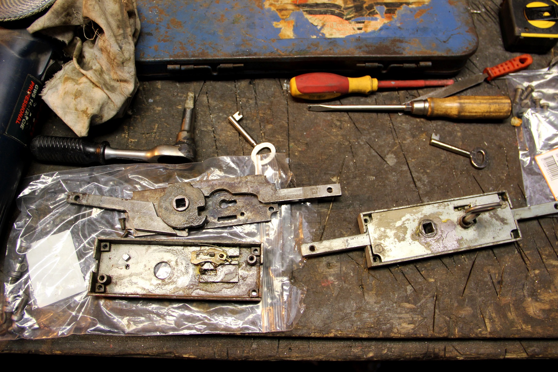Die Schloesser der Staukasten funktionieren nicht wirklich, ich nehm sie auseinander und wir basteln uns aus alten Schluesseln passende..