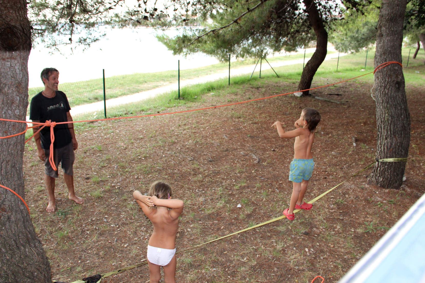 Auf dem etwas kargen Autocamp in Zadar paccken wir erstmal wieder unser Slackline aus..