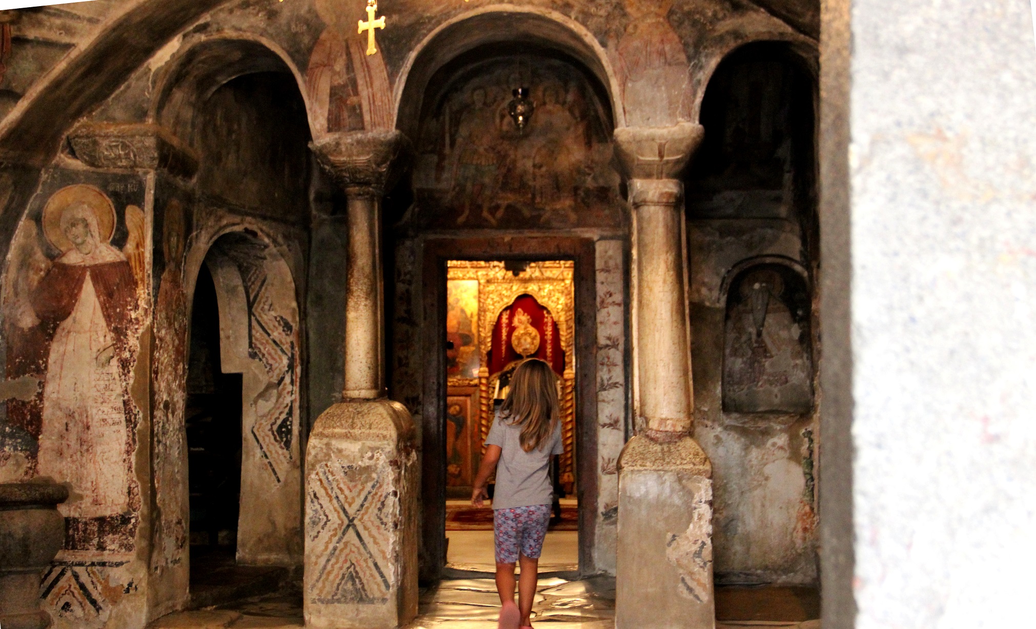 Der heilige Sv. Naum war nicht nur Missionar sondern auch Wunderheiler. 900 n Chr. erbaute er sein Kloster, in dem er Geisteskranke heilte und Besessene von Daemonen befreite. Naja jedenfalls wurde das Kloster bis zum 19. Jhd als Sanatorium guer psychische Erkrankungen genutzt. Die kleine, urige Kirche ist die Schoenste, die wir in unserem Leben gesehen haben. Die Wandbemalungen (Fresken) sind um 1800 entstanden.