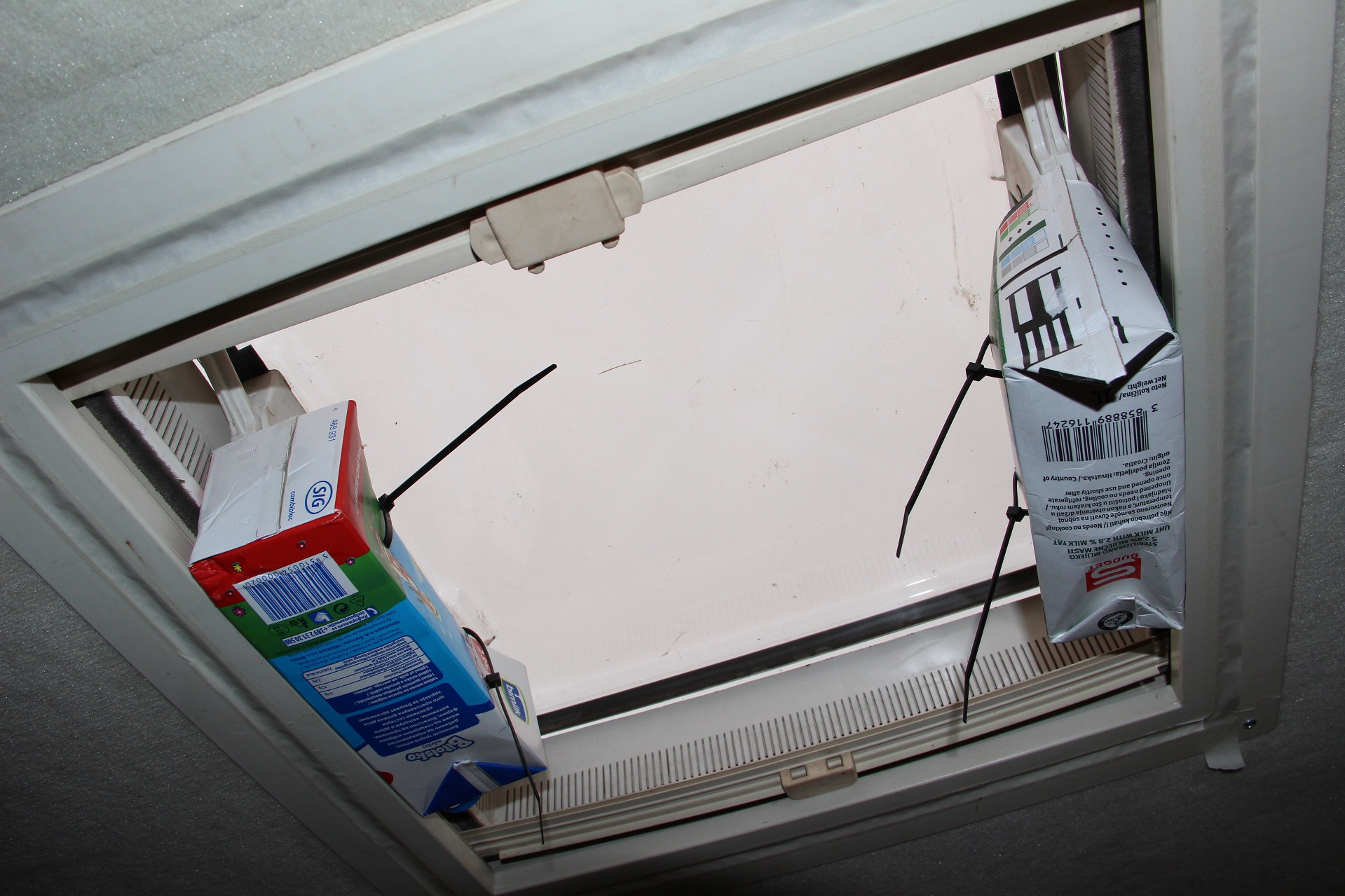 Der erste Regen.. Ahhh! Unsere Dachfenster sind schwer undicht! Marcus bastelt eine Uebergangsloesung um das Regenwasser aufzufangen…