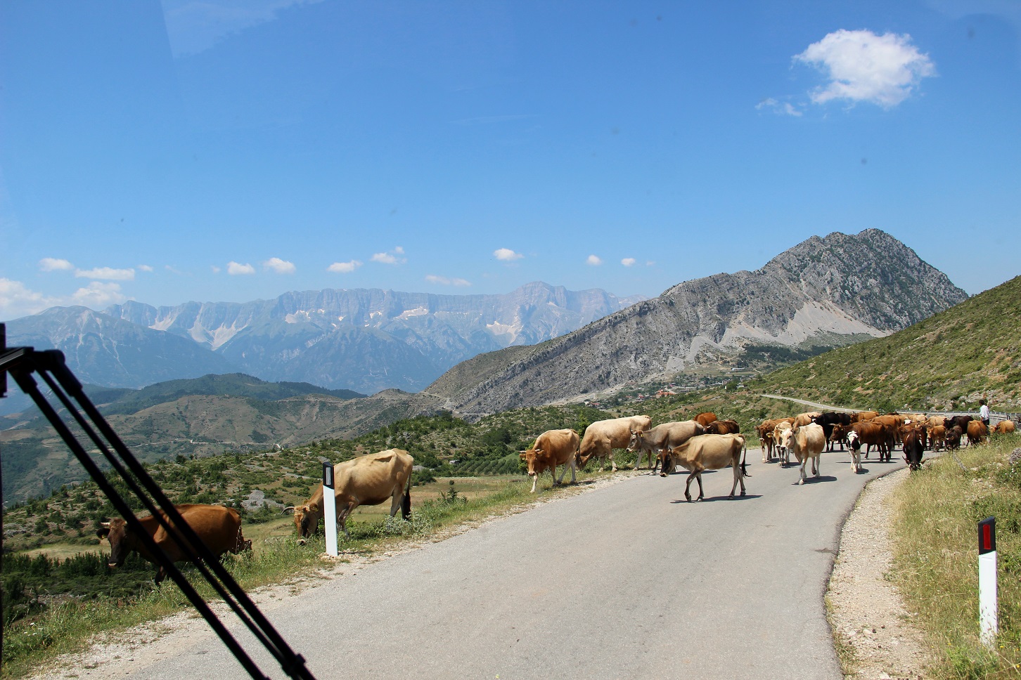 Auf dem Weg nach Leskovik, der 1.400 m hohe Mali i Melesit und im Hintergrund zieht immer wieder das 2.400 m hohe Nemeckes Gebirgsmassiv alle Blicke auf sich..