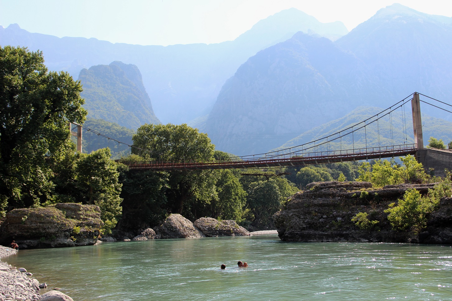 Hier bleiben wir mit unserer Reisegruppe und stuerzen uns in den kuehlen Strom der Vjosa. Bei 40 Grad ganz angenehm!