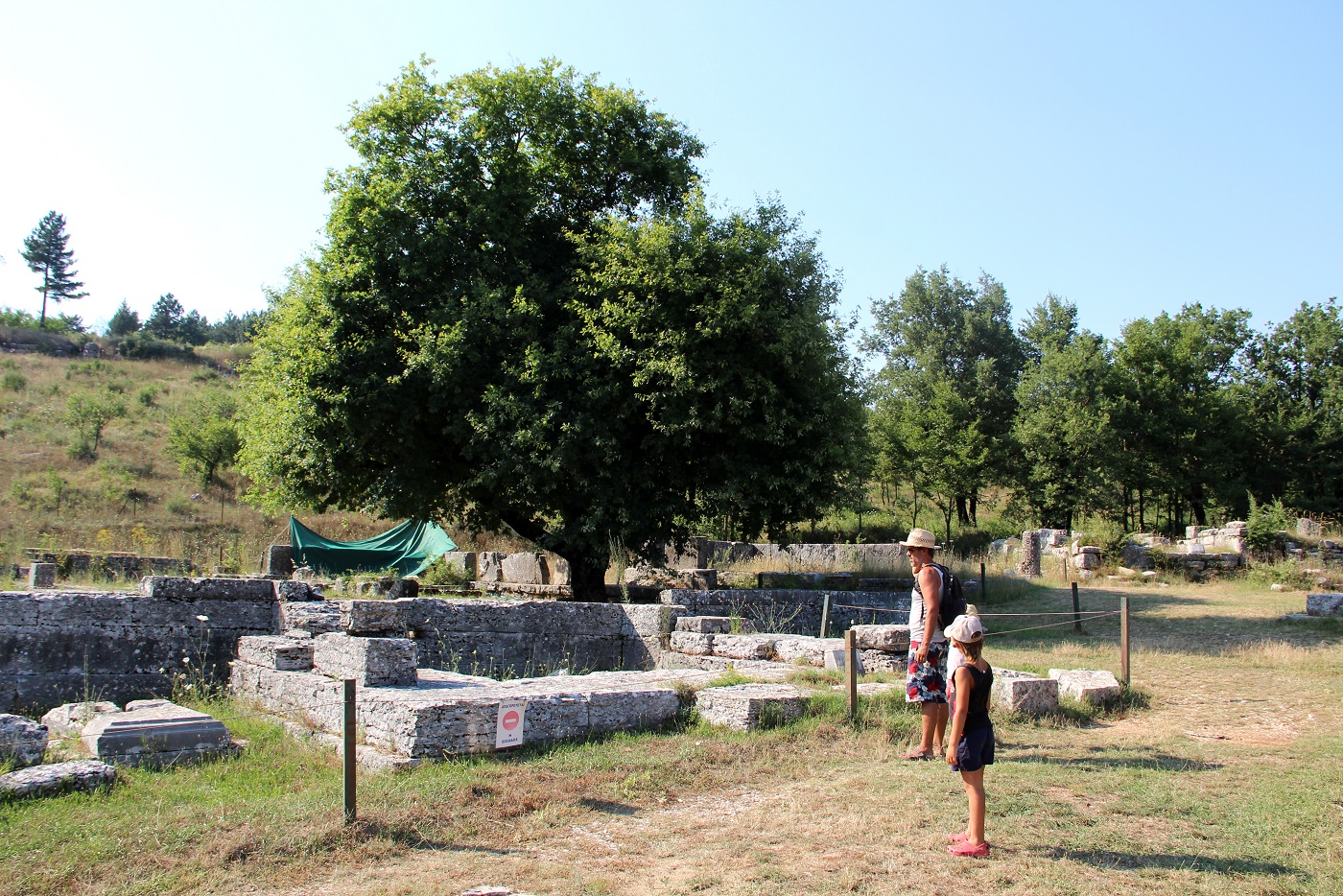 Die Grundmauern mehrerer Tempel aus verschiedenen Zeiten. Der groesste von ihnen, vor dem wir da stehen, die eigentliche Orakelstaette mit der heiligen Eiche, war Zeus geweiht. Seine Priesterinnen entnahmen den Orakelspruch dem Rauschen der Eiche, zogen spaeter aber auch Losorakel und den Flug heiliger Tauben zu Rate.. Wir lauschen zwar gespannt der Eiche, aber werden nicht so ganz schlau draus..