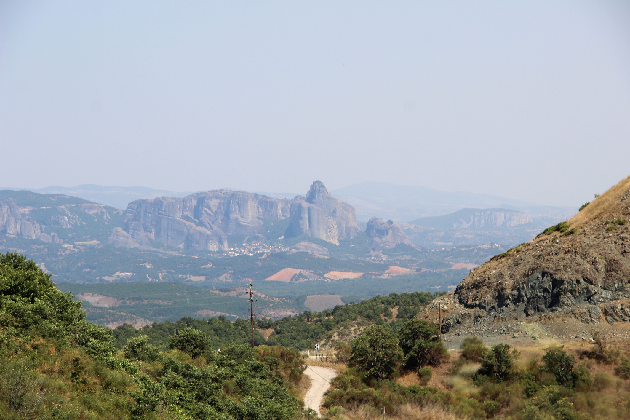 und schwupp die wupp sind wir auch schon in Thessalien. Inder Ferne sehen wir schon die Meteora Felsen. Das letztes Ziel unserer Reise. Die bizarren Formen der aus Konglomertsandstein geformten Felsen entstanden laut unseres Reisefuehrers vor vielen Millionen Jahren durch Wassermassen, die in die Ebene herabstuerzten! Die Felsen sind jetzt ungefaehr 400 m hoch.