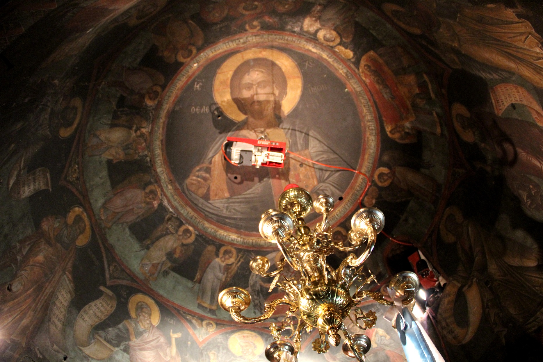 Eine kleine Kuriositaet: unter der Decke haengt jetzt eine elektrische Seilwinde, damit man auch schoen einfach an den Kronleuter kommt. Tihi..