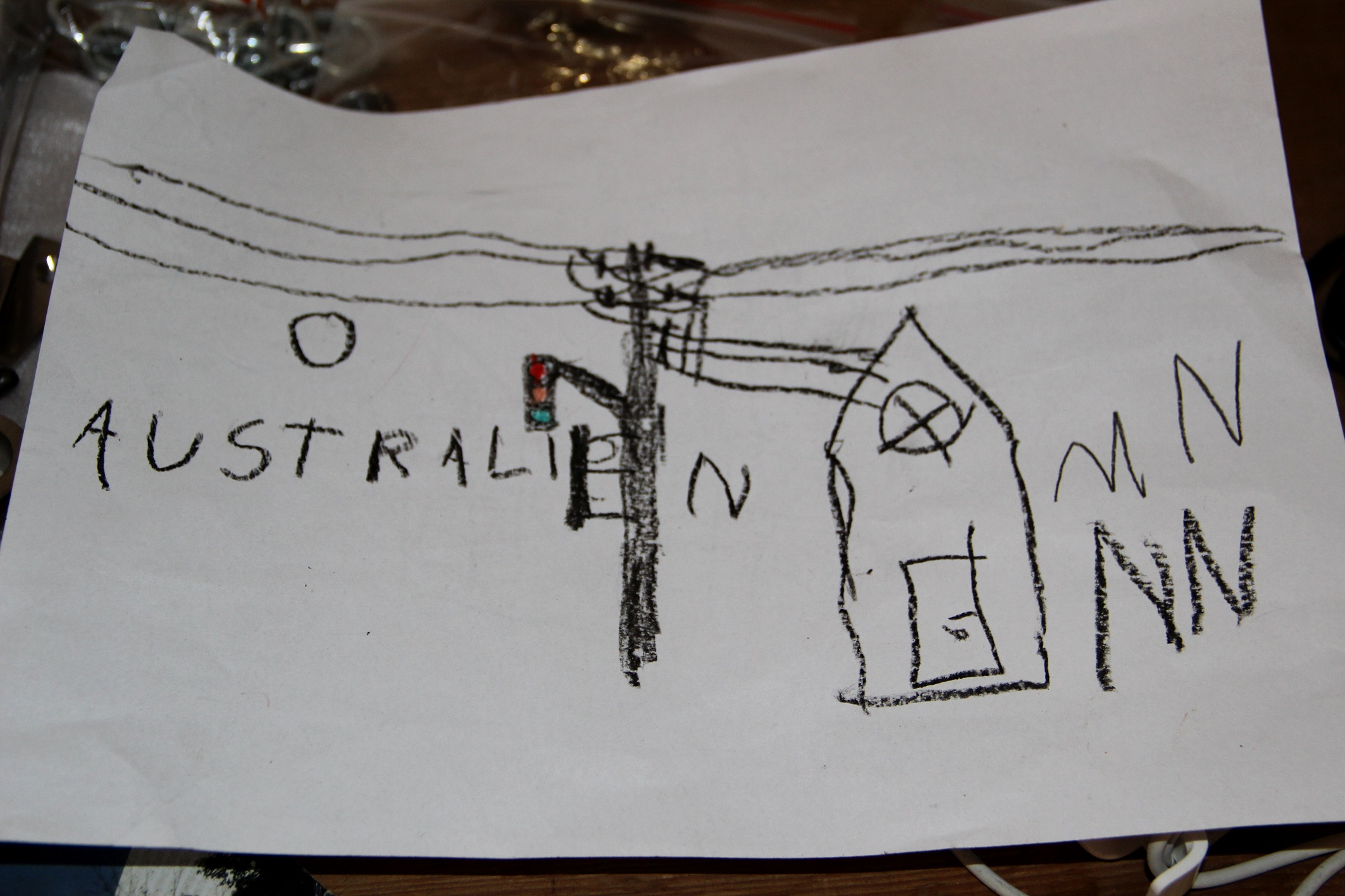 Dabei hat er so gute Ideen: man kann doch die Haeuser an diese grossen Strommasten anschliessen. Dann haben alle Strom! Ja genau Jaron!!