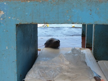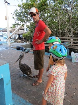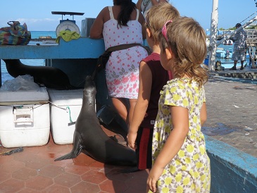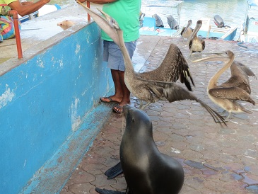 Seit dem ersten Tag sind wir Dauergaeste auf dem Fischmarkt. Die Tiere sind soo zutraulich und verstehen sich untereinander auch. von links nach rechts: Robbe, Leguan, Pelikan, ein anderer Vogel, Jaron und Lina.. hihi