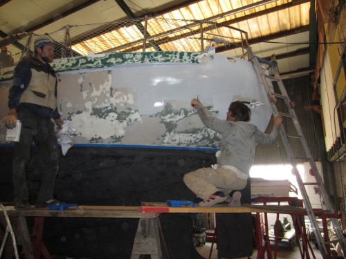 Ca 10 Tage wird sie in der Halle bleiben. Das ist hoffentlich genug Zeit, um sie komplett neu anzustreichen. Wir würden gerne noch das Deck neu machen, aber wenn dafür keine Zeit mehr übrig ist, werden wir das unterwegs nacharbeiten..