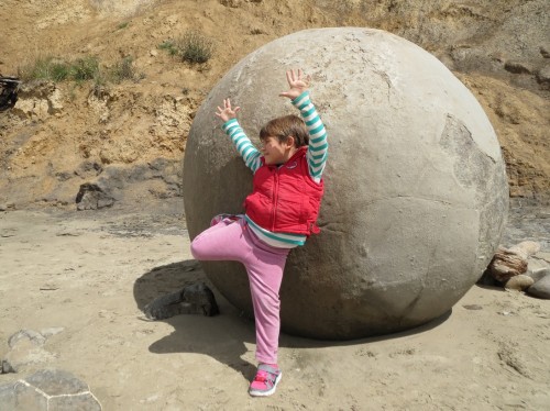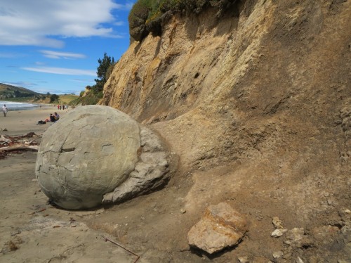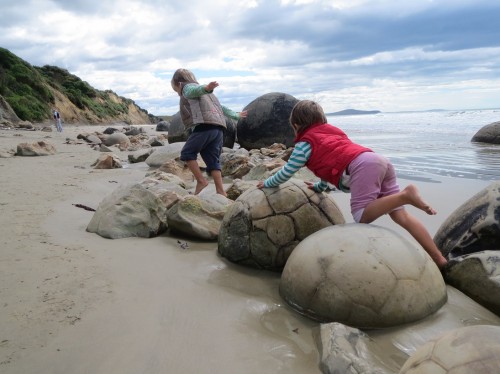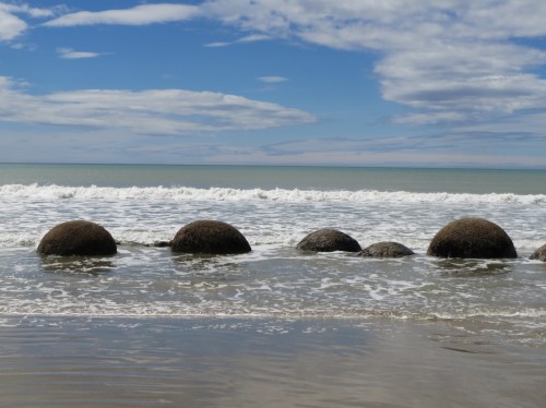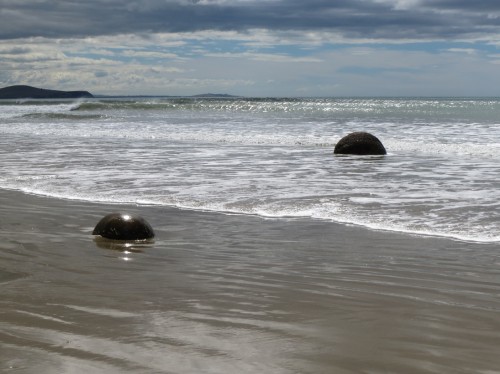 Moeraki Boulders – die Steine sind mehr als 4 Mio. Jahre alt und das Meer wäscht den Sand drumherum “grad” weg..