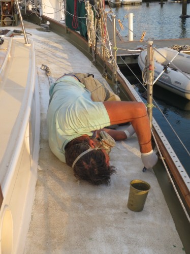 Karate Kid lässt grüßen.. Wir haben doch tatsächlich die Backbordbacke fertig poliert und gewachst (und schön die Arme abgewechselt..) Das Deck ist bis auf den “Laufweg” auch fertig. Man was ne Schufterei, aber es lässt sich echt sehen! Ein bissi traurig sind wir schon darüber, dass wir den “Laufweg” jetzt nicht mehr geschafft haben. Möp möp dann wärs perfekt gewesen, aber was solls, jetzt ist erstmal was Anderes dran..