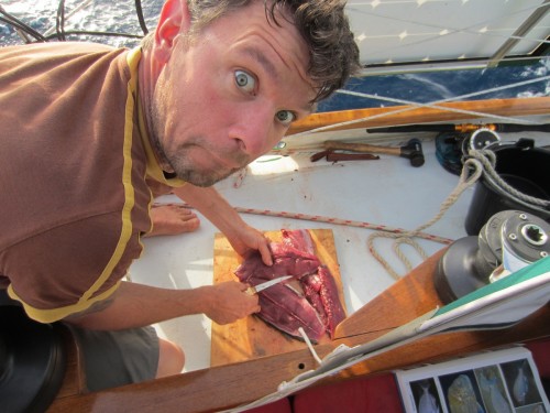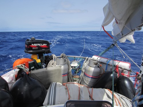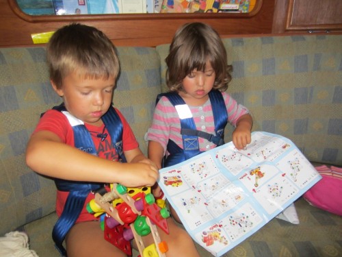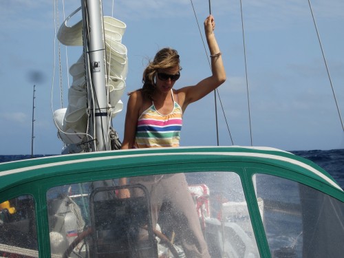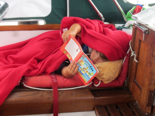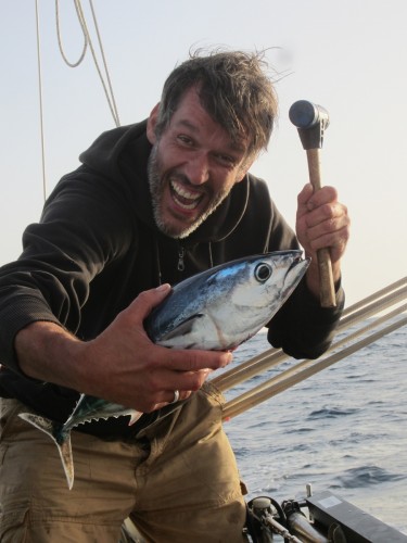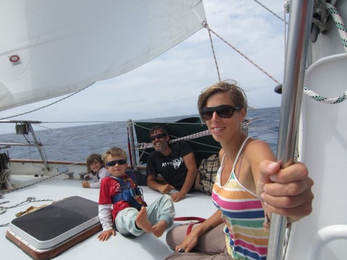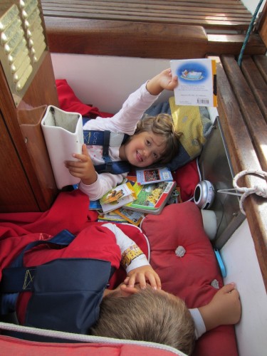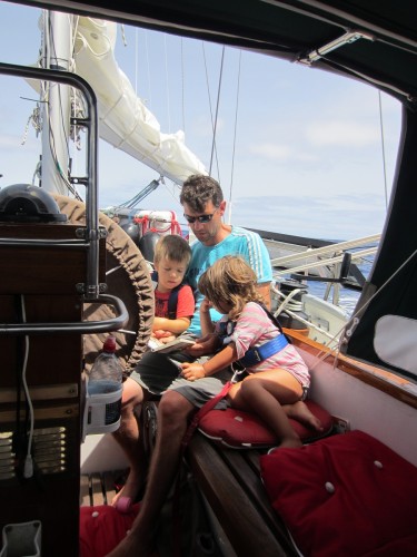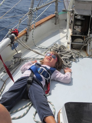 Zuerst einmal ist hier das Meer und dann ist hier auch noch das Meer und dann kommt das Meer und danach kommt erst mal ganz lange gar nix…. Wir haben den Absprung geschafft und sind jetzt ungefähr auf der Hälfte auf dem Weg zu den Kanaren. Bergfest nennt man das glaub ich.. Wir haben uns ganz gut eingeschaukelt und haben bis jetzt kaum Verluste zu melden. Marcus hat zwar ein Anti-Seekrank-Pflaster hinterm Ohr kleben, aber ich glaub mittlerweile das hat er nur da sitzen, weil ihm die Dröhnung gefällt.. Außer einem mulmigen Gefühl sind wir alle von dem ÜBEL verschont geblieben. Gestern hats unseren Spibaum gerockt, aber Bernd und Marcus haben ihn schön zurecht geflext (dank Akkuflex) und nu ist er halt ein wenig kürzer. Das heißt aber leider, dass wir den Wind nicht mehr genau von hinten nehmen können.. Egal.. Das Wetter ist traumhaft, wir segeln Backstag mit 12-23 Knoten Wind und unser letztes Etmal betrug 140 Seemeilen (ich bin ganz stolz, dass ich das ausgerechnet hab..). JA und das erfreulichste ist: Unser neuer Autopilot funzt hervorragend! Wir wechseln uns in 4 Stunden Schichten ab und bewundern dabei eigentlich nur unser Steuerrad, dass sich ganz von alleine dreht! Wunderbar! Sonst passiert hier eigentlich gar nix. Die Kids spielen, schauen sich Bücher an und hören MP3’s und wir Großen wundern uns, warum wir vom nix tun so müde sind. Ich hätte den Blog eigentlich auch „das große Gähnen“ nennen können. Ach heute ist was aufregendes passiert: Wir sind eine Wende gefahren.. Höhö.. Ein paar wenige Delfine gabs heut zu sehen und eine Schildkröte, die sich wohl irgendwie verschwommen hat. Achso das wichtigste hab ich natürlich vergessen: Marcus und Bernd haben letzte Nacht einen Tunfisch geangelt. Ostrea soll ichs mal buchstabieren? TUNA.. Alle waren mächtig stolz und uns hängt der Fisch schon langsam zum Halse raus. Zum Glück isst Bernd alles auf.. Sowieso macht sich Bernd hier sehr beliebt. Die Kleinen finden ihn total toll und wir Großen auch 🙂 .so long..