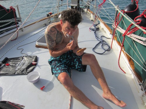 Zuguterletzt noch der Gast an Board NautikBernd er versucht seine Knoten im Hirn zu lösen und hat fast immer Schicht !!!!!!!!!!!!!!- man(n) man(n) man(n) und Essen kann der da bleibt vom Fish nichts übrig 😉