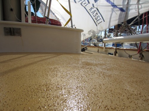 Wir warteten in der Marina eigentlich nur noch auf ein Paket aus Deutschland (was leider bis jetzt nicht angekommen ist), da beschlossen wir wenigstens das Deck mal wieder zu streichen. Das Dritte mal in diesem Jahr! Aber es war halt immer noch zu rutschig. Wir also ordentlich am Pinseln und Sand einstreuen, aber leider nur mit mäßigem Erfolg. Jetzt rutscht man zwar nicht mehr so, aber dafür kleben einem kleine Sandkörner mit 1K-Lack unter den Füßen. Arrgh! Das heißt dann wohl, dass wir demnäxt das ganze Deck nochmal abschleifen müssen und mit gutem 2K-Lack unser Glück versuchen. Yo es soll uns ja auch nicht langweilig werden..