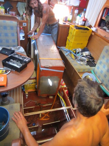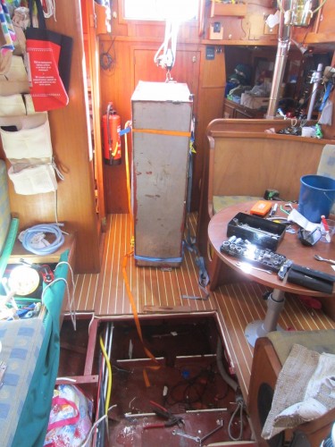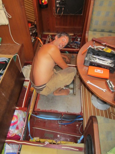 Als näxtes untersuchte Marcus unsere ..hm..ja wie soll ich sagen? Motor-Wellen-Aufhängung oder so. Es vibrierte etwas zu viel und tatsächlich musste mal wieder alles auseinander geschraubt werden und der Motor neu justiert werden. Mit Hilfe von John (dem SuperSchrauber von Gran Canaria) ging es dann auch. Das ganze hat Marcus fast 3 Tage volle Arbeit gekostet, aber ich bin ganz stolz, dass er mittlerweile solche Sachen alleine erkennen kann. Wow. Ganz nebenbei bemerkten wir dann noch ein klitzekleines Loch in unserem Trinkwasser Edelstahltank. Groß genug allerdings, um den Tank leer zu tröpfeln. Danke! Natürlich konnte man den Tank nicht im eingebauten Zustand schweißen, nein, das wäre viiiiiel zu einfach gewesen. Der Tank musste natürlich ausgebaut werden, damit er rundum neu geschweißt werden kann. ABER: der Tank passte leider nicht durch unsere Luke raus! Hm! Irgendwie hätten wir uns das auch denken können. Er ist genau 0,8 cm zu breit. Da haben die Holländer (die unsere Supermolli gebaut haben) sich bestimmt was bei gedacht, aber wir kommen einfach nicht drauf was es sein könnte. Nun musste also der Tank unter Deck geschweißt werden. Leider nicht einmal rundherum sondern nur an dem Stück der aufgeplatzten Schweißnaht. Wenn wir nicht mitten auf dem Atlantik ein neues klitzekleines Loch entdecken wollen, müssen wir da nochmal dran. Aber erst mal ist er wieder dicht. Seit dem spinnt allerdings die Wasserpumpe. Marcus hat heut einen Pumpen aus und ein und aus und ein -bau tag eingelegt. Ich glaube ehrlich gesagt die Neue ist auch hinüber, aber ich wollte ihn vor dem Schlafen gehen nicht mehr fragen. Mir ist seine pumpende Halsschlagader aufgefallen. Die funktionierte einwandfrei 🙂