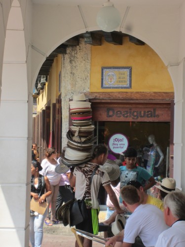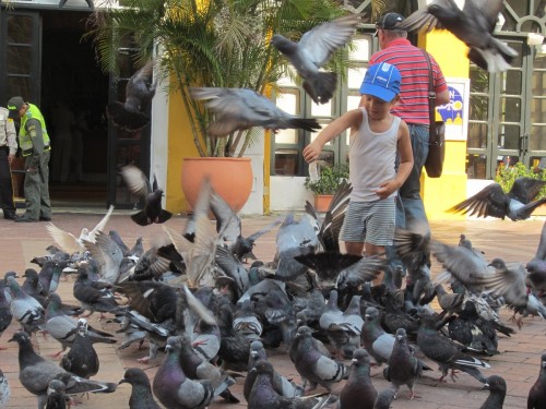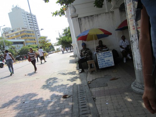 ich weiß nicht, ob mans erkennen kann, aber hier unter dem Schirm werden die wichtigen Dokumente der Behörden für die Columbianer erstellt. Auf einer alten Schreibmaschine. Und was ich auch noch total beeindruckend fand, waren die kleinen Bauchläden mit 4 Handys angekettet – also eine colombianische Telefonzelle…