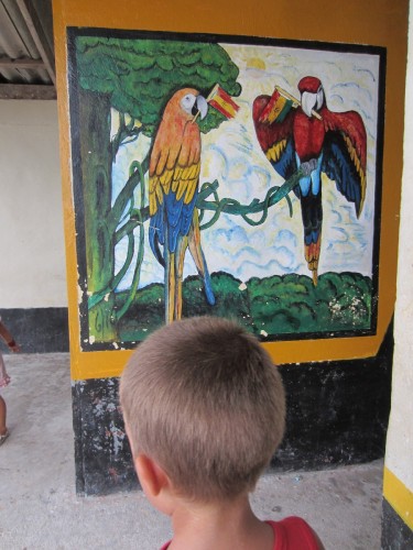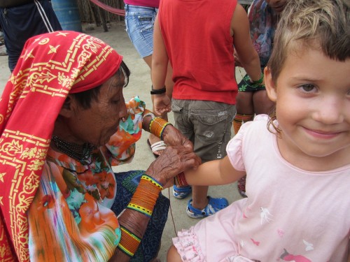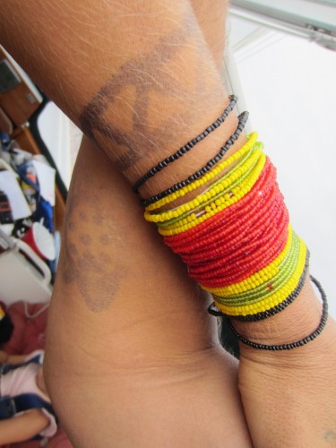 Columbianische Indio Tattobemalung zusammen mit der Kuna Perlenkunst (Marcus meinte ja ihm sei eine Schildkröte gemalt worden, aber ich hab eine eindeutige Blume erkannt..)