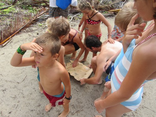Schatzsuche am Strand und Jaron vermutet ihn wohl auf einer Palme..